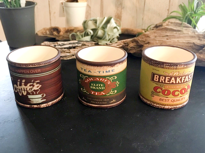 アンティークの缶を思わせる個性的なポット。合わせるグリーンによって、シックにもポップな雰囲気にもできる万能ポットです。