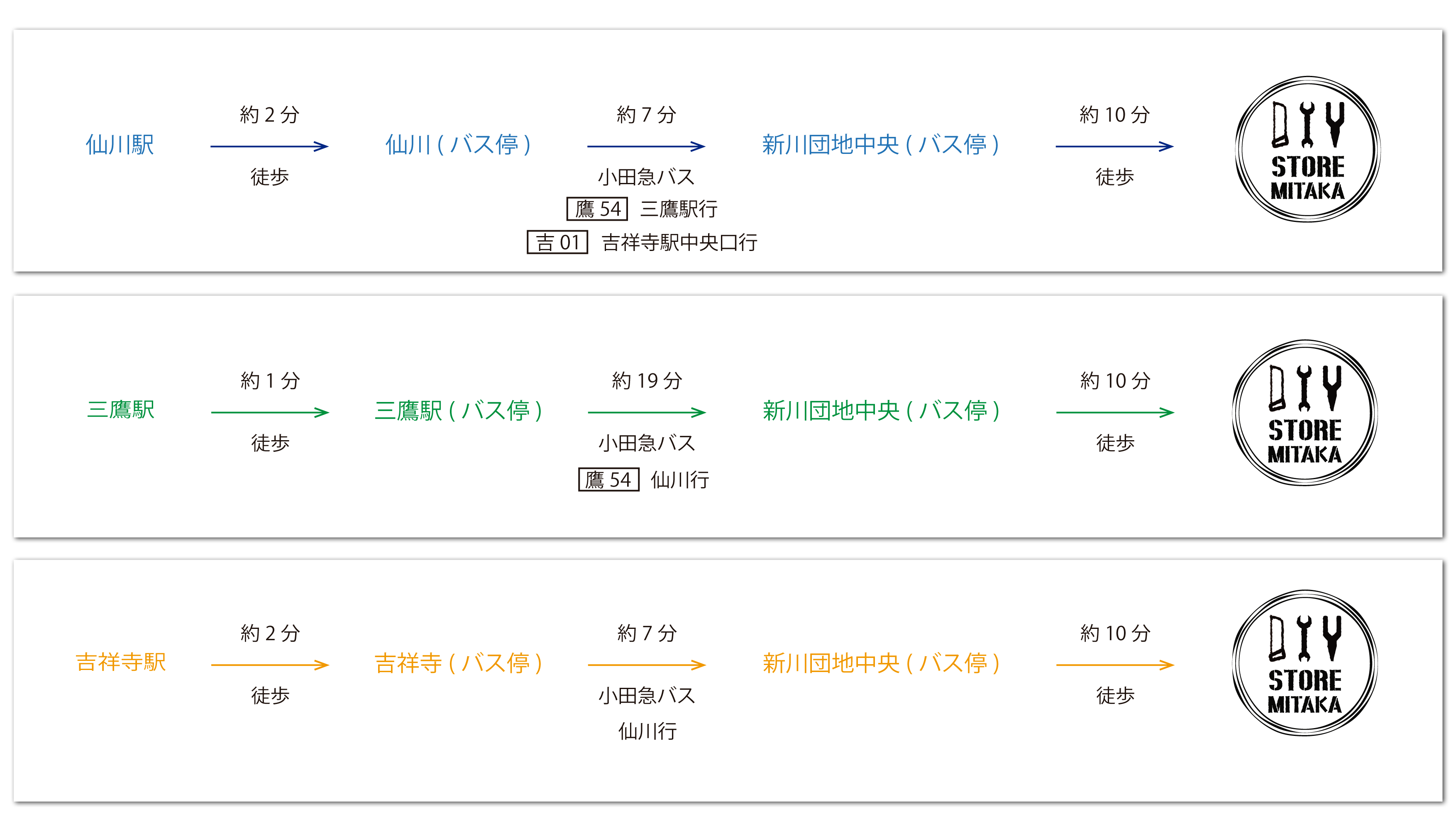 仙川駅・三鷹駅・吉祥寺駅の各駅よりバスにご乗車頂き、バス停「新川団地中央」より徒歩10分程度です。
